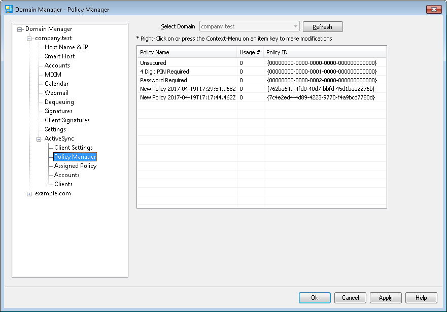 Use this screen to manage the ActiveSync Policies that can be assigned to user devices to govern various options. Predefined policies are provided, and you can create, edit and delete your own. Default and overriding policies can can be assigned to the domain and each account and client on their respective Assigned Policy screens.