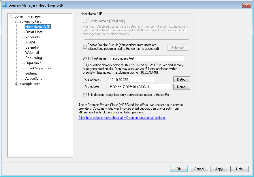 In most cases the FQDN will be either the Domain name or a subdomain of it (for example, “mail.example.com”), but an IP literal syntax such as “[192.0.2.0]” may also be used. When no FQDN value is specified, MDaemon will use the Default Domain’s FQDN.