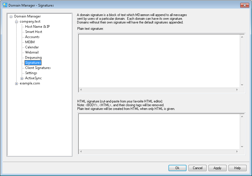 Use this screen to append a signature to all messages sent by this domain's users. If no signature is specified here then the Default Signature will be appended instead. Signatures are added to the bottom of messages, except for mailing list messages using a footer, in which case the footer is added below the signature. You can also use the Account Editor's Signature feature to add individual signatures for each Account. Account signatures are added just before Default or Domain Signatures.