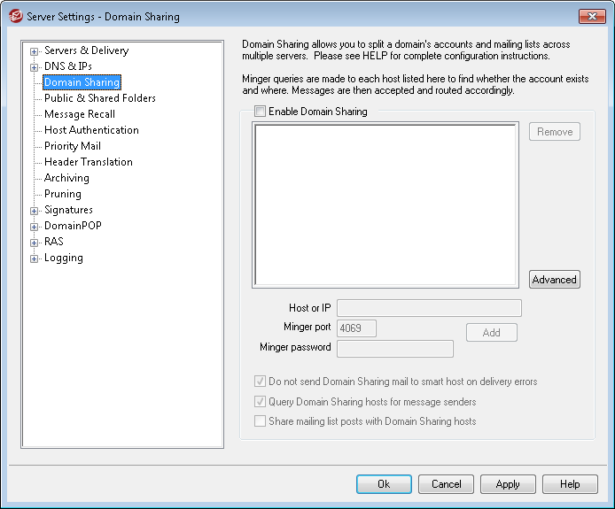 Check this box to enable Domain Sharing. After you have enabled Domain Sharing and added all of the Domain Sharing hosts or IP addresses to the list, ensure that you have also enabled and configured Minger so you can respond to queries from those hosts when they attempt to verify your local addresses.