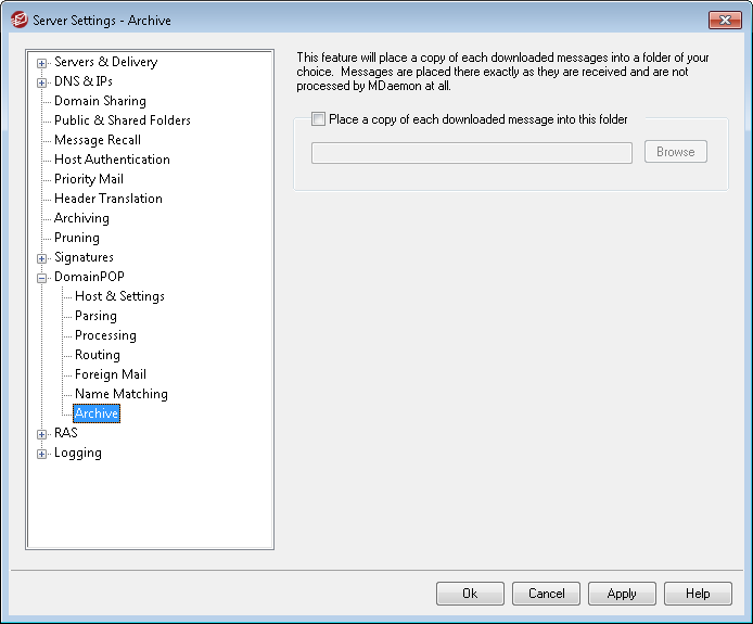 This is a safety feature to ensure that you don't lose any mail due to unforeseen parsing or other errors that might occur when downloading mail in bulk quantities. Check this box if you wish to save a copy of each downloaded message into the folder that you specify. These copies are placed in the folder exactly as they are received and are not processed by MDaemon at all.