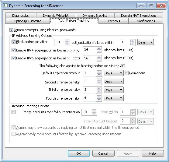 This option applies to the IP Address Blocking Options and to the Account Freezing Options below. By default, when an authentication attempt fails, subsequent authentication attempts will be ignored when using the same password. They will not count against the number of failures allowed before blocking the IP address or freezing the account. Multiple attempts using the same, incorrect password typically occur when, for example, the user's email password has changed or expired and their client is automatically attempting to log in using the old one.