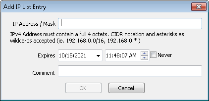 1. Click Add. This opens the Add IP List Entry dialog.