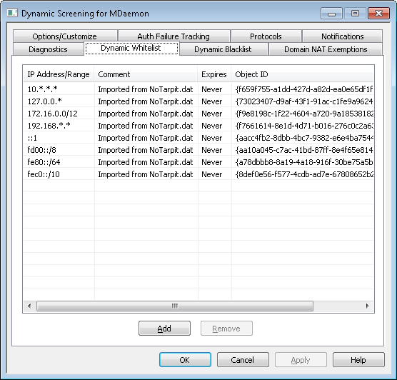The Dynamic Whitelist contains the list of IP addresses or address ranges that will be exempts from blocking by the Dynamic Screening service when they attempt to connect to MDaemon. Addresses can be added to the Dynamic Whitelist by clicking the Add button. Each entry contains the IP address or range, the date and time that the entry will expire (or "Never," if it won't expire), any comment that you wish to make about the entry, and an Object ID. The Dynamic Whitelist is also used by the SMTP Screen, Location Screening, and Tarpitting.