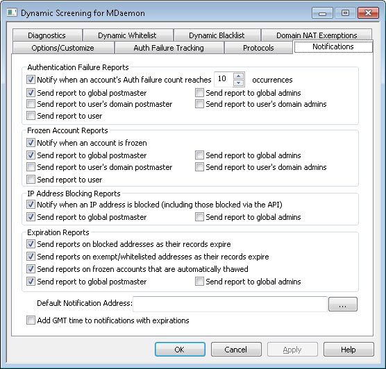This option causes MDaemon to send a notification message to a postmaster or other selected recipient any time an account is blocked by the Dynamic Screening system. If none of the selected addresses can be resolved, MDaemon will send the message to the Default Notification Address designated below. If no address has been specified, the message will not be sent. The option is enabled by default.