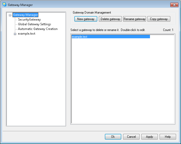 The navigation pane on the left side of this dialog contains the list of your gateways, with links to each screen used for configuring the various gateway-specific settings. It also provides access to the Global Gateway Settings and Automatic Gateway Creation screens. The list on the right is used for deleting and renaming domains. You can double-click a gateway in this list to switch to the gateway editor for configuring its settings.
