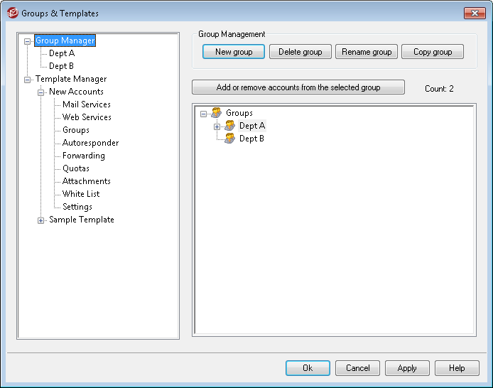 To create a new Account Group, click New group, type a name and description for the group, and click OK. The new group will appear in the list of groups below and in the left pane.