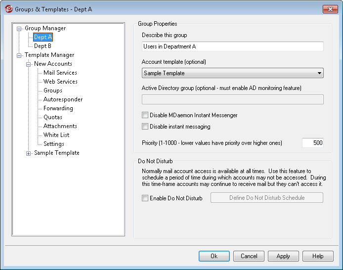 The Group Properties screen (Accounts » Groups & Templates... » [group name]) is used to configure the settings for each group you have created using the Group Manager. To open Group Properties from the Group Manager, double-click the group you wish to edit, or click the name of the group in the left pane. On this screen you can assign an Account Template to a group, allowing you to control a variety of account settings for group members. You can also link the group to an Active Directory group, control whether or not group members have access to MDaemon Instant Messenger (MDIM) and instant messaging, and set a priority level for the group. To control group membership, use the Group Manager and Mail Folder & Groups screen on the Account Editor.