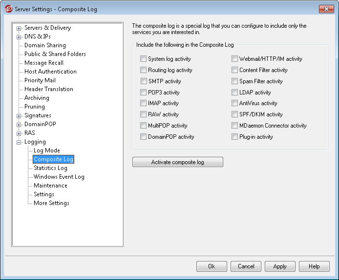Plugin activity—Logs MDaemon plugin activities to the composite log.