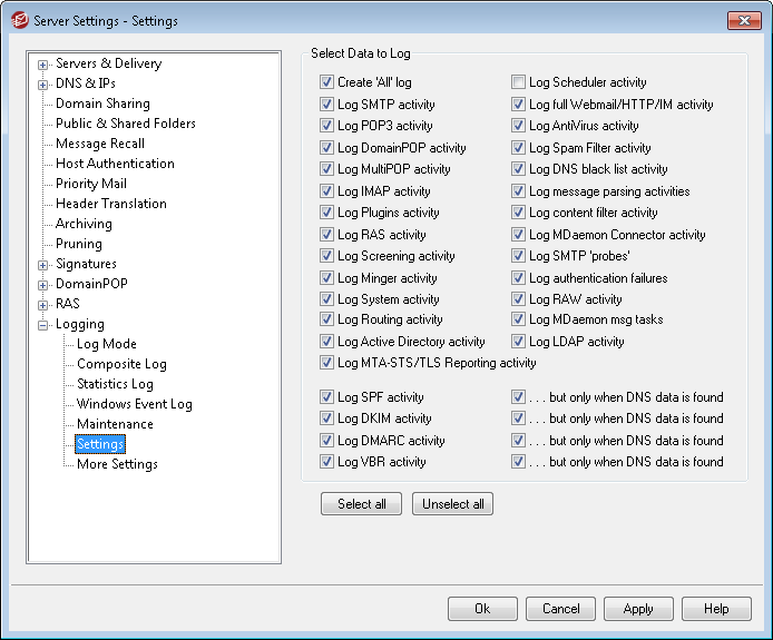 Click this checkbox to log all DomainPOP mail activity.