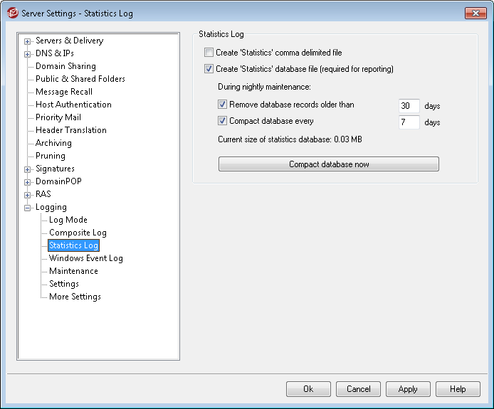 Check this box if you wish to log statistical information about MDaemon's activity to an SQLite database file. The database contains data on MDaemon's bandwidth usage, number of inbound and outbound messages, spam statistics, and the like. By default this database is stored in the "MDaemon\StatsDB" folder and 30 days worth of data are saved, but you can adjust how long to keep the data if you wish to retain more or less than the default 30 days. Data older than the designated limit will be removed during the nightly maintenance process. You can also specify how often MDaemon will compact the database to conserve space.