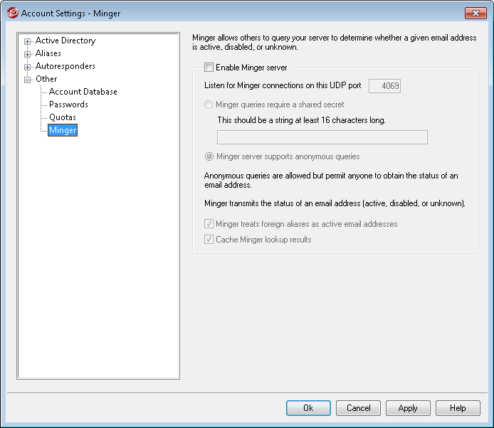 Located under Accounts » Account Settings, Minger is an email address verification protocol created by MDaemon Technologies. Originally based loosely on the Finger protocol, Minger is primarily intended to provide a simple and efficient mechanism for allowing others to query your server in order to verify whether or not an email address is valid. For efficiency Minger uses UDP rather than TCP, and for security it can require authentication—though it supports anonymous queries as well. The Minger dialog is used to enable/disable MDaemon's Minger server, designate the port that it will use (the default is 4069), and choose whether to require authentication via a shared secret system or to allow anonymous queries.