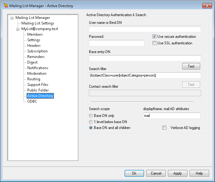You must use this field to specify the attribute that will contain the email addresses used by this list. For example, if you used "Mail" in this field, then each Active Directory account that you wish to be treated as a list member must have the "Mail" attribute, and that attribute must contain an email address. You can additionally enter an Active Directory attribute for the full name field of list members before the email address attribute, separated by a comma. For example, you could enter: "displayName, mail" rather than just "mail" in this option. The first is the Active Directory attribute where the full name resides, and the second is the email attribute.