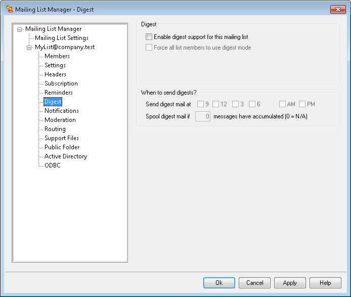 Check this box if you wish to allow digest support for this mailing list. When digest support is enabled, a copy of each message sent to the mailing list will be archived so that list members who have their membership type set to Digest will periodically be sent batches of these archived messages in a compact and indexed format rather than receive them one at a time.