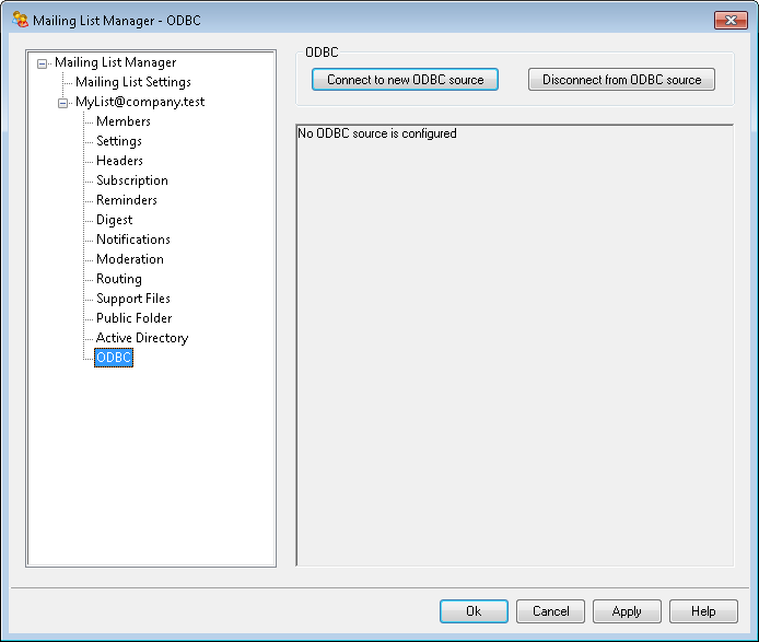 Using this feature you can maintain the list's membership list in an ODBC compliant database. The ODBC screen of the Mailing List editor is used to select a data source, table, and field mappings for MDaemon to link to the list. When messages arrive for your list one or more SQL queries will be performed automatically and the resulting email addresses will be treated as part of the list's membership.