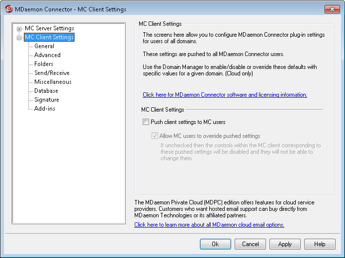 Use the MC Client Settings dialog to centrally manage the client settings of your MDaemon Connector (MC) users. Configure each screen with your desired client settings and MDaemon will push those settings to the corresponding client screens as necessary, each time an MC user connects to the server. The MC Client Settings are only sent to clients when one of the settings has changed since the last time the client connected and received them. If the option below to "Allow MC users to override pushed settings" is enabled, users can override any pushed settings on their individual clients. If that option is disabled, then all of the client screens are locked; MC users can make no changes.