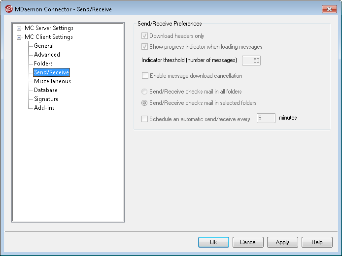 MDaemon Connector displays a progress indicator when downloading a large number of messages. Clear this checkbox if you do not wish to display the progress indicator.