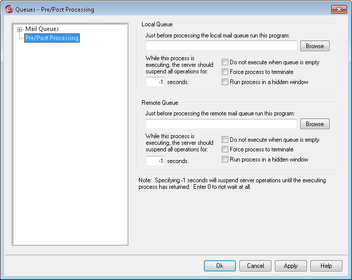 The value entered here determines how MDaemon will behave while the specified program is in progress. MDaemon can be configured to pause its execution thread for the number of seconds specified while waiting for the process thread to return. If the process returns before the number of seconds has elapsed, MDaemon will resume its execution thread immediately. If you enter "0" in this option MDaemon will not suspend operations at all. Entering "-1" will cause MDaemon to wait until the process returns, no matter how long that might be.