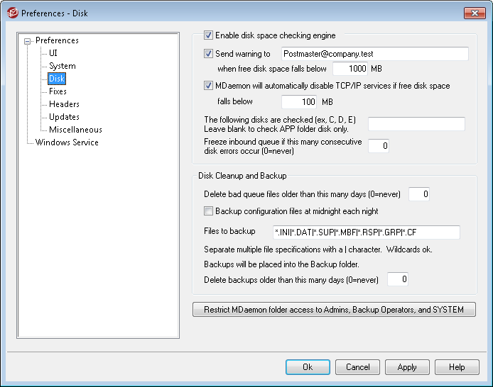 MDaemon will automatically disable TCP/IP services if free disk space falls below [xx] MB