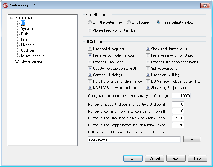 Notepad.exe is the general text editor that the MDaemon UI will launch by default when needed. If you prefer to use a different text editor, enter its file path or executable name here.