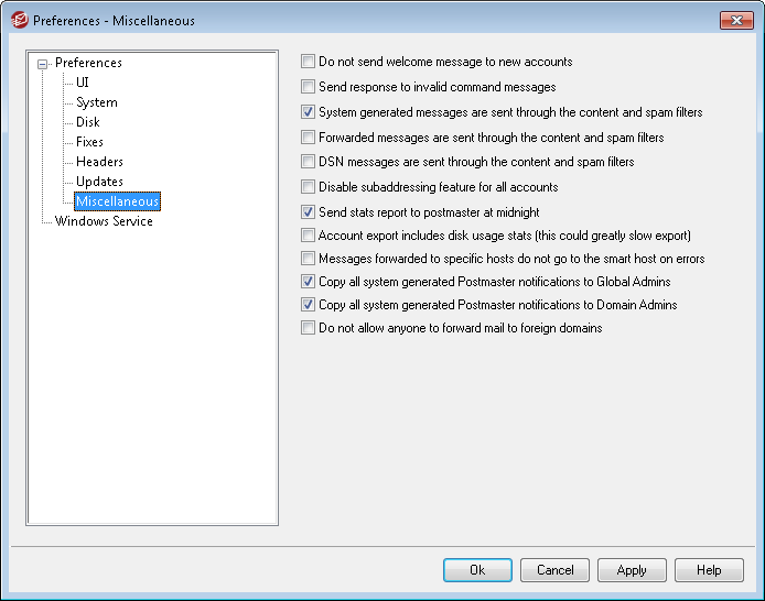 By default, system generated notifications sent to the Postmaster will also be sent to the Global Administrators. Global administrators receive everything including the Queue Summary report, Statistics report, Release Notes, 'No Such User' found (for all domains), Disk Error notifications, Account Freeze and Disable notifications for all domains (which, like Domain admins, they can unfreeze and re-enable), warnings about licenses and beta test versions about to expire, Spam Summary reports, and so on. If you do not want your global administrators to receive these notifications, disable this setting.