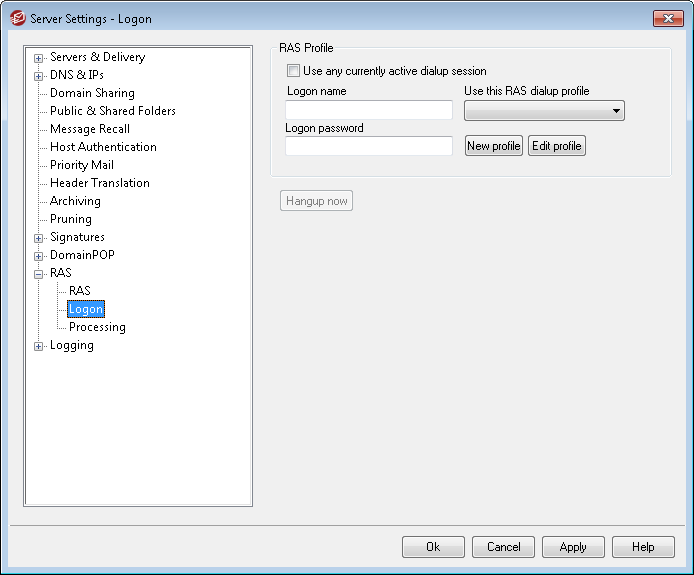 This button will close the connection to the ISP. This button is active only when MDaemon initiated the RAS session.