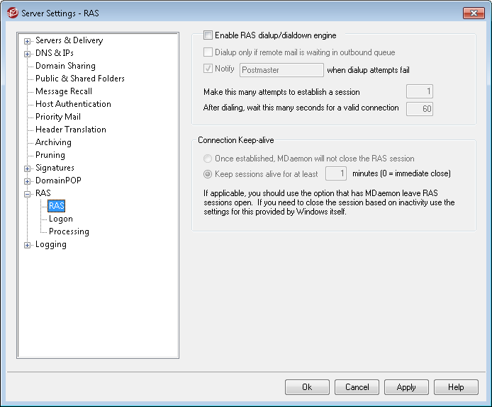 Once established, MDaemon will not close the RAS session