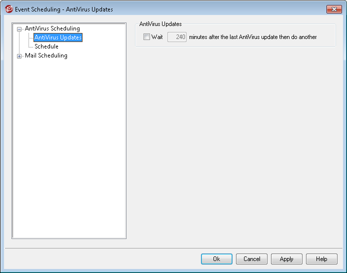Click this checkbox and specify the number of minutes that you want AntiVirus to wait before checking for new virus signature updates. Note, this is actually the number of minutes that AntiVirus will attempt to wait after the last time you checked for an update, whether the update was triggered by the scheduler or manually. The scheduler and manually triggered updates are given precedence over this setting and will therefore reset this counter if an AntiVirus update event is triggered by one of those other methods. Thus, for example, if you have this option set to check for updates every 240 minutes and you manually check for an update after 100 minutes, this counter will be reset to 240.