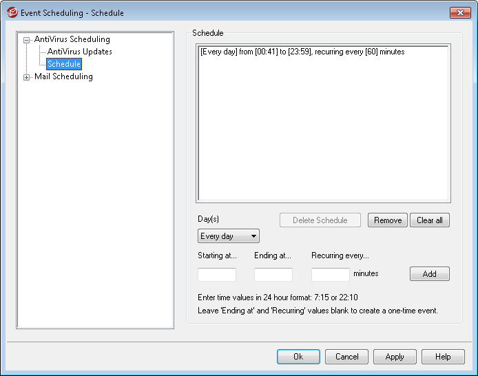 This is the time interval at which AntiVirus will check for updates between the designated Starting at... and Ending at... times. Leave this option blank if you wish it to be a single event rather than recurring event.