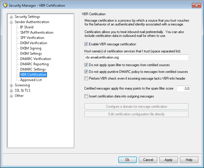 The VBR Certification dialog is located at: Security » Security Settings » Sender Authentication » VBR Certification.