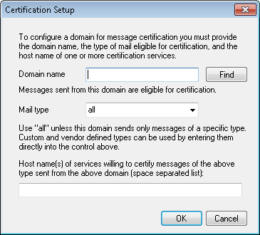After enabling the Insert certification data into outgoing messages option above, click this button to open the Certification Setup dialog. On this dialog you will designate the domain whose outbound messages will be certified, the types of mail that will be certified, and the CSPs associated with the domain.