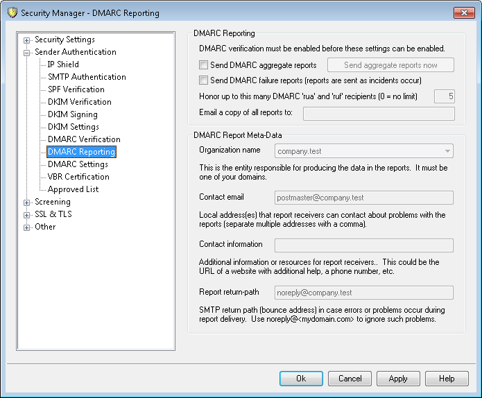 When MDaemon queries DNS for a DMARC record, the record may contain various tags indicating that the domain owner wishes to receive DMARC reports regarding messages claiming to be from that domain. The options on the DMARC Reporting screen are for designating whether or not you wish to send DMARC aggregate or failure reports to the domains whose DMARC records request them, and for specifying the meta-data those reports will contain. The options on this screen are only available when the "Enable DMARC verification and reporting" option is enabled on the DMARC Verification screen. Further, the DMARC specification requires the use of STARTTLS whenever it is offered by report receivers. You should therefore enable STARTTLS if possible.
