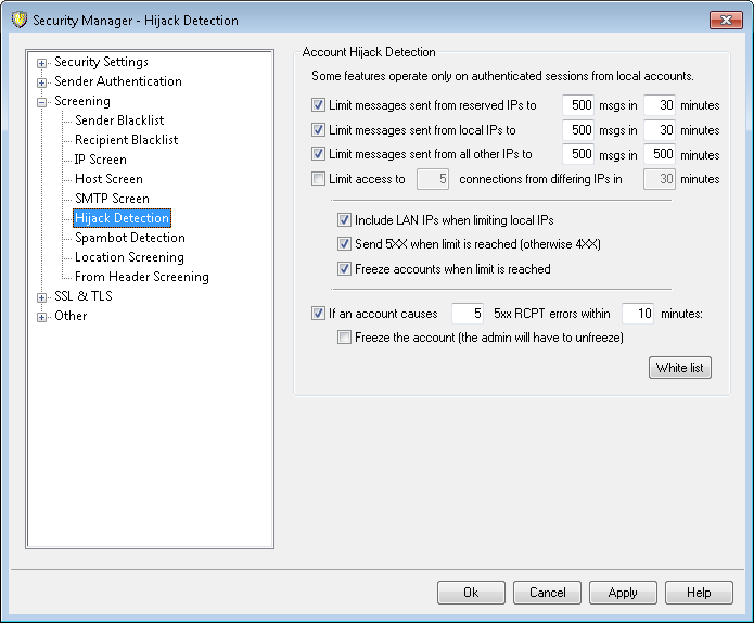 The options on this screen can be used to detect a possibly hijacked MDaemon account and automatically prevent it from sending messages through your server. For example, if a spammer somehow obtained an account's email address and password then this feature could prevent the spammer from using the account to send bulk junk e-mail through your system. You can designate a maximum number of messages that may be sent by an account in a given number of minutes, based on the IP address from which it is connecting. You can also choose to disable accounts that reach the limit. There is also a White List that can be used to exempt certain addresses from this restriction. Account Hijack Detection is enabled by default.