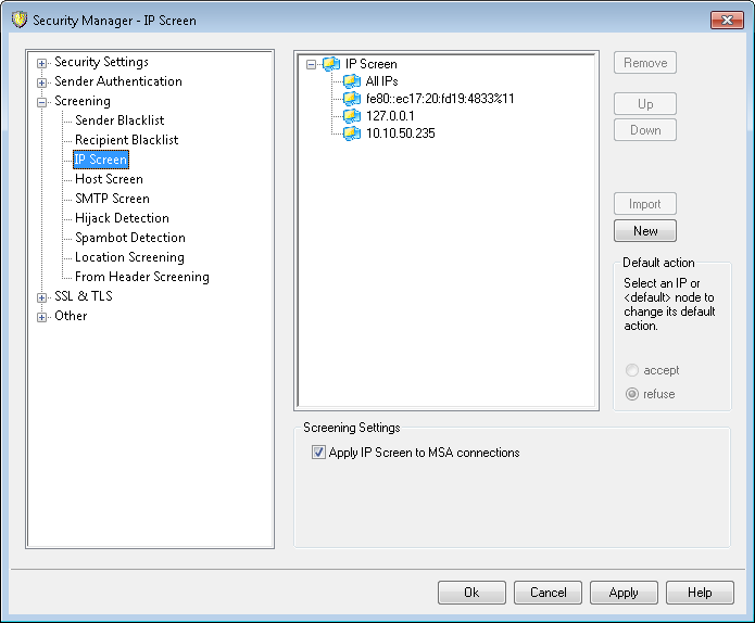 Use this option to apply IP Screening to connections made to the server's MSA port. Normally this is not necessary. This setting is enabled by default.