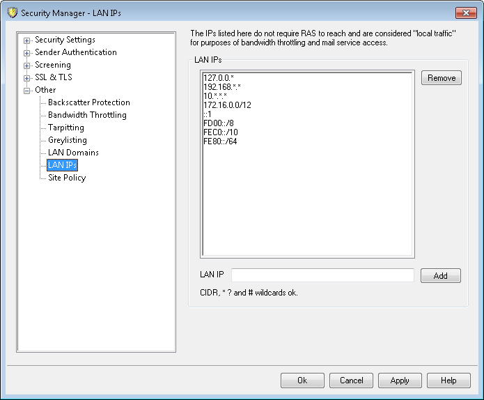 Similar to LAN Domains, this screen is used to list IP addresses that reside on your LAN (local area network). These IP addresses therefore do not require RAS or an Internet connection to reach them, and they are treated as local traffic for the purposes of bandwidth throttling. Further, there are various other security and spam prevention restrictions that they may be exempt from since they are local addresses.