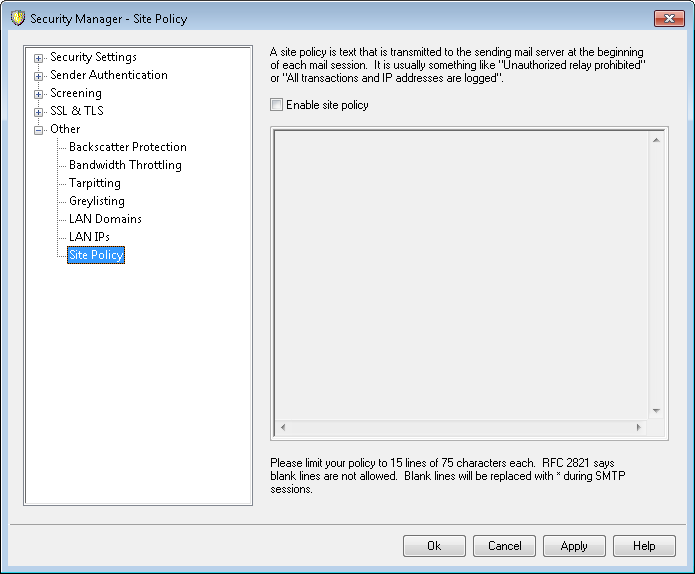 Use this dialog to specify a Site Policy statement for your server. The text is stored in the policy.dat file located in MDaemon's \app\ subfolder and is transmitted to sending servers at the beginning of every SMTP mail session. An example of a common site policy is, "This server does not relay" or "Unauthorized use prohibited." You do not need to prepend each line with "220" or "220-". MDaemon handles each line accordingly, either with or without these prepended codes.