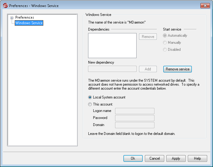 When running MDaemon as a Windows service, by default it runs under the SYSTEM account. Because this account does not have access to network devices, MDaemon will not be able to access mail if you wish to store it on other computers across your LAN. That is, not unless you provide logon credentials for an account that can be used to provide the MDaemon service access to network shares. If you need to do this then you can create a Windows user account specifically designed for running MDaemon with whatever restrictions that you desire, but which has access to those network shares that you want MDaemon to be able to use. Further, all applications launched by MDaemon will use the same credentials.