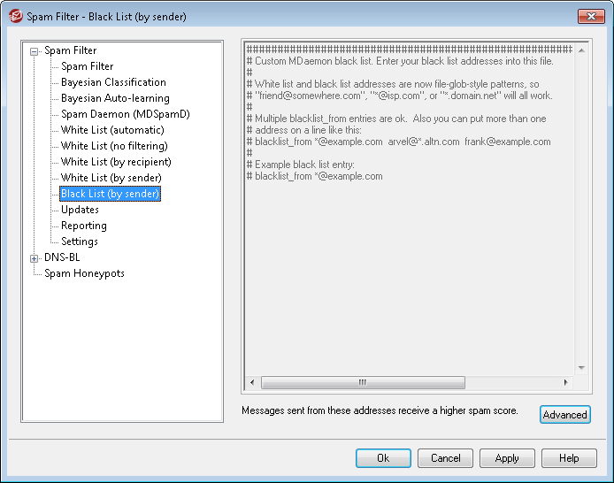 Click Advanced to add addresses to this list. Messages from addresses on this black list will have their Spam Filter score increased by the amount specified on the Spam Filter Settings screen, typically causing them to be marked as spam. However, including an address on this list does not automatically guarantee that a message from that address will always be considered spam. For example, if a message comes from a black listed sender but is addressed to a white listed recipient, then the score modifiers may offset each other and cause the message to have a final score that is below the spam score threshold. This could also happen if you have the black list score modifier set particularly low.
