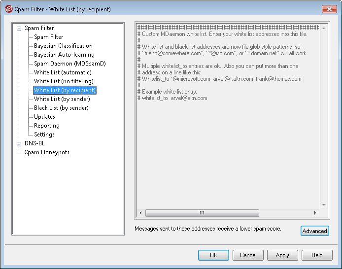 Click Advanced to add addresses to this list. This list is similar to White List (no filtering), except that rather than exempting messages for the recipient from Spam Filter processing, they will be processed but have their Spam Filter score reduced by the amount specified on the Spam Filter Settings screen. Therefore including an address on this white list does not automatically guarantee that a message to that address will not be considered spam. For example, if you have the spam score threshold set to 5.0 and the white list value set to 100, and then a particularly excessive spam message arrives that gets a spam score of 105.0 or higher before the white list value is subtracted, then the final spam score of the message will be at least 5.0, thus denoting it as spam. This is highly unlikely, however, because spam rarely has a value that high unless it contains some other exceptionally high-scoring element, such as a blacklisted address.