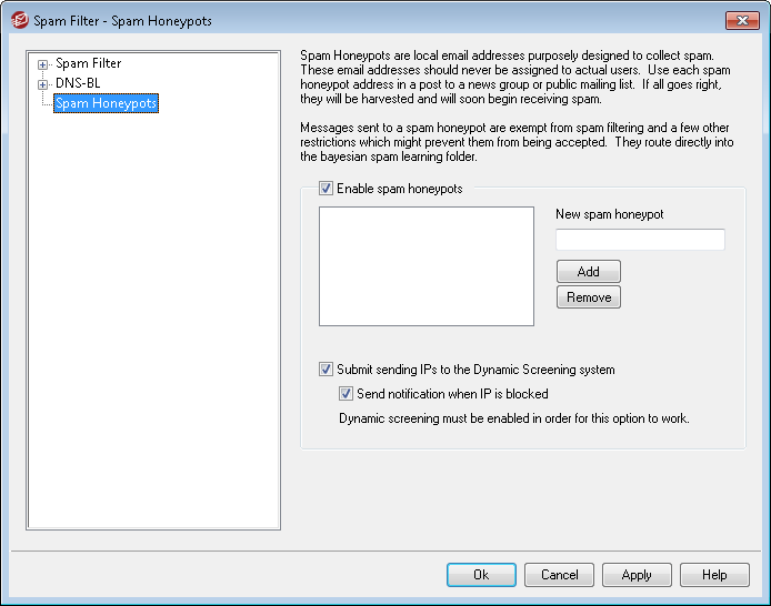 Spam Honeypots (located at Security » Spam Filter » Spam Honeypots) is for designating local email addresses purposely designed to collect spam. These spam honeypots are not valid MDaemon accounts or address aliases and should never be used for sending or receiving legitimate email. But, by posting a honeypot address to a news group, public mailing list, or other source from which spammers often farm addresses, you should begin to see incoming messages addressed to the spam honeypots — you could also pull addresses from other spam that you have received addressed to other invalid local addresses. Because honeypots will never receive legitimate email, all incoming messages addressed to them will always be routed directly to your Bayesian spam learning folder for processing. Further, the IP addresses of the sending servers can optionally be added to the Dynamic Screening system, banning future connections from those addresses for a designated period of time. All of this helps increase the probability of identifying and blocking spam in the future.
