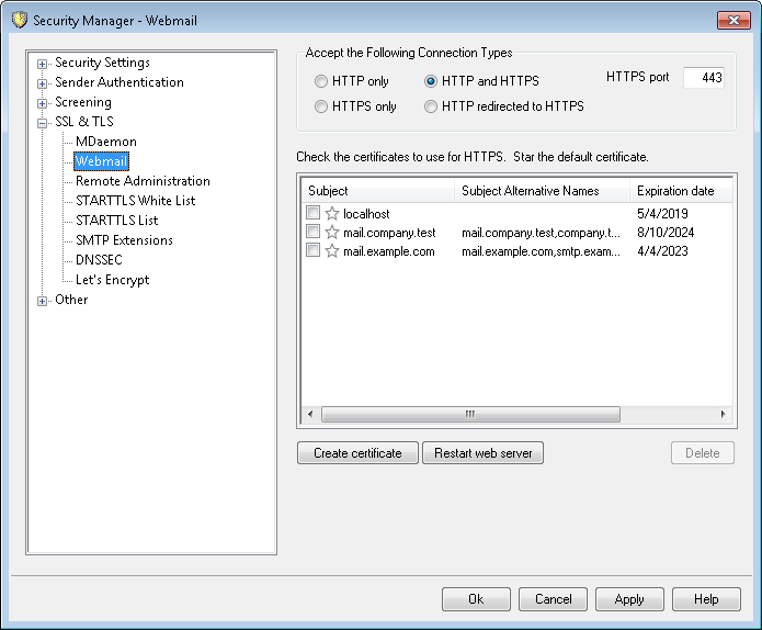This screen only applies to Webmail when using MDaemon's built-in web server. If you configure Webmail to use some other web server such as IIS, these options will not be used SSL/HTTPS support will have to be configured using your the other web server's tools.