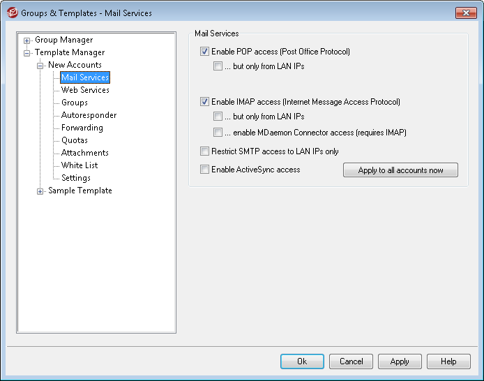 This option is only available on the New Accounts template. Click this button to apply this screen's settings immediately to the Mail Services and ActiveSync for MDaemon screens of all existing MDaemon accounts.