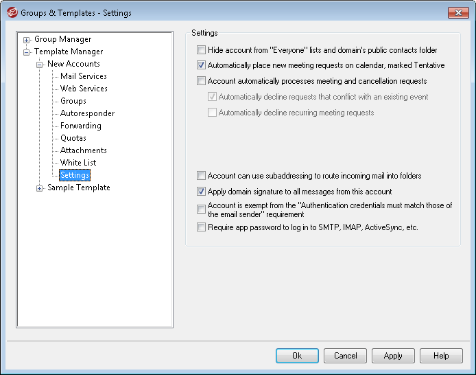 The options on this template screen correspond to the settings located on the Account Editor's Settings screen. When a template is set to control this screen, it will control the Settings screen for any account belonging to a Group that utilizes the template.
