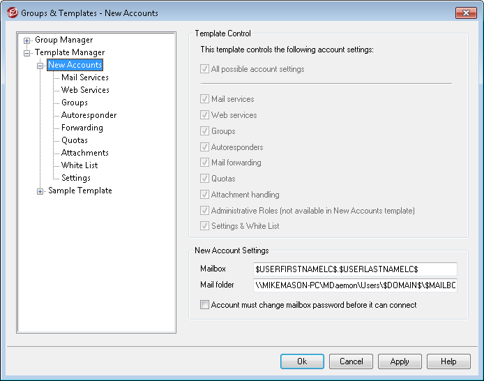 Use this field to control the default Mail folder that will be used for new accounts. Each account's Mail folder is where its email messages will be stored on the server. For example, "...\$DOMAIN$\$MAILBOX$\" would create the path, "...\example.com\michael.mason\" for the user, "michael.mason@example.com".