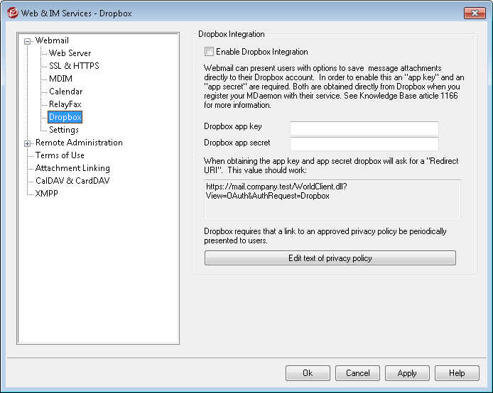 Click this button to edit the text file containing your Webmail App's privacy policy. Because Dropbox requires that an approved privacy policy be periodically presented to your users, a "Privacy Policy" link to the contents of this file is provided on the Connect to Dropbox page displayed to your users. That link opens a small window containing the text and a Download button that users can click to download the file. Use HTML code in the file if you wish to format the text or want it to contain any links.