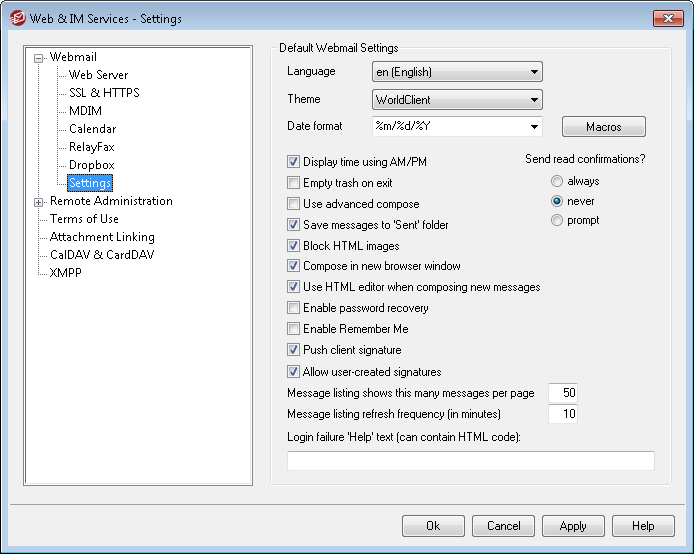 This screen designates the default settings for the Domain Manager's Webmail Settings screen. When a user signs in to Webmail, these options govern how various Webmail features initially work for that user. Many of these settings can then be customized by the user via the Options pages within Webmail.