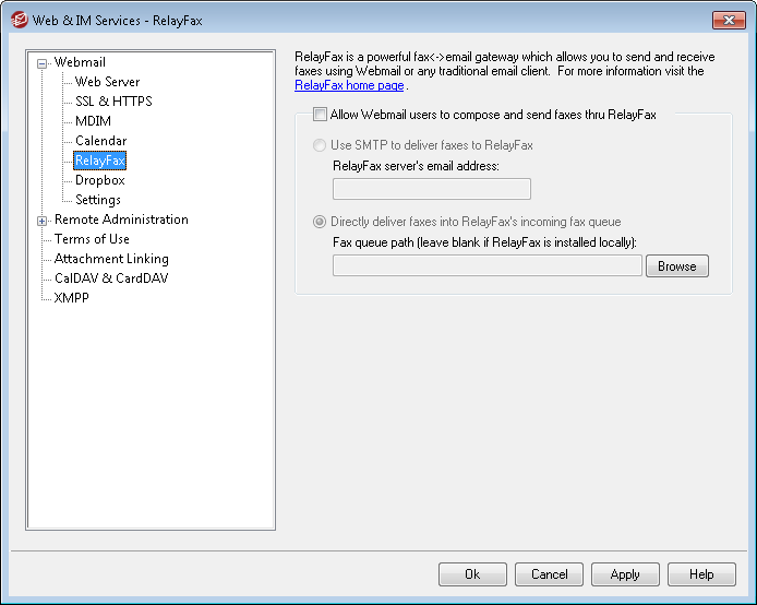 Click this option to integrate RelayFax with Webmail. When active it will cause a "Compose Fax" control and other fax related features to appear on the Webmail pages.