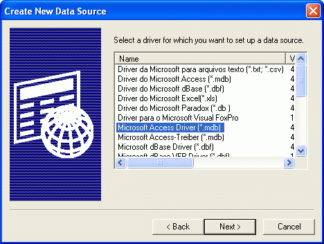 5.Select the database driver for which you wish to set up the data source, and click Next.