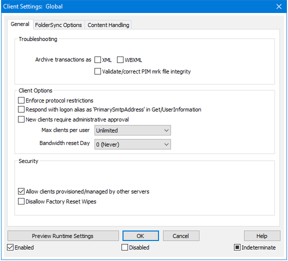 If set to On/Yes, the ability to Full Wipe an ActiveSync Client will not be available. If you wish to be able to do a full remote wipe on a client, you must first disable this option. The option is disabled by default. For more information, see: Full Wiping an ActiveSync Client on the Clients page.