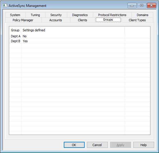If you wish to define customized ActiveSync Client Settings for an account Group, use this screen to manage those settings. All groups are listed here, and each group's entry indicates whether or not customized settings have been defined for it. To edit a Group's Client Settings, double-click the Group, or right-click the Group and click Customize Client Settings.